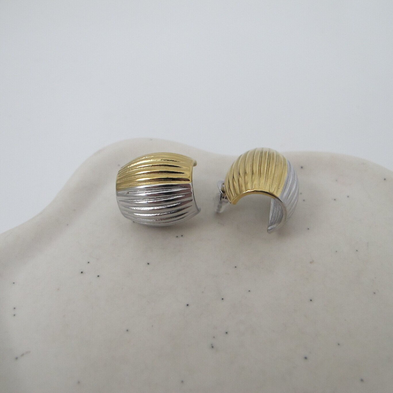 Αυτά τα ανάγλυφα σκουλαρίκια με τις κάθετες ραβδώσεις θυμίζουν πολύτιμα vintage κομμάτια, ενώ η δίχρωμη επιφάνειά τους (μισό χρυσό, μισό ασημί) τους δίνει μια απόλυτα σύγχρονη πινελιά. Το ημικυκλικό τους σχήμα αγκαλιάζει το αυτί, προσδίδοντας όγκο και λάμψη σε κάθε σας κίνηση.